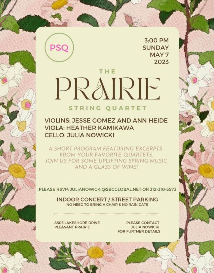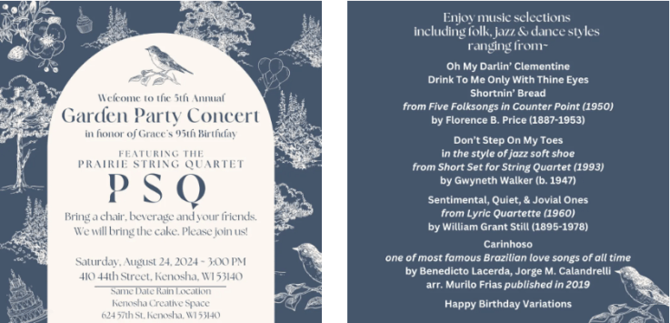 The Prairie String Quartet will be playing at the Kenosha Performing Arts Festival! The Kenosha Creative Space Inc., a leading arts organization in downtown Kenosha, is hosting a celebration of the performing arts on October 5-6, 2024. The Kenosha Performing Arts Festival will bring together performers throughout the Kenosha area for a weekend of live performances at four… Continue reading Kenosha Performing Arts Festival - 5th Annual Garden Party Concert